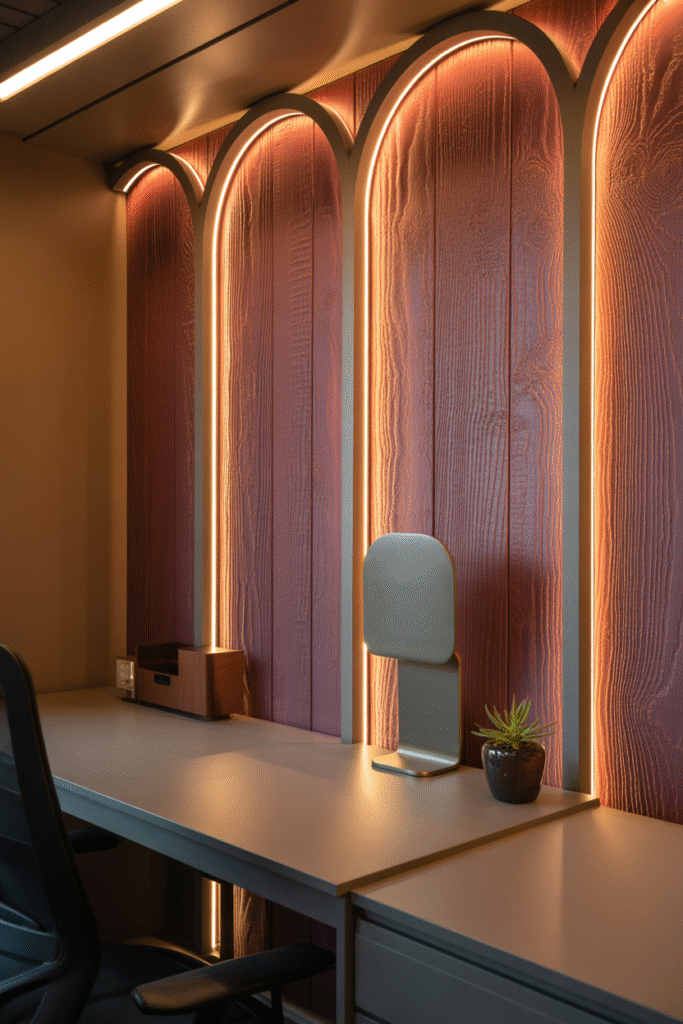 Without windows, walls can feel flat. Add interest through vertical slat wood panels, painted arches, or textured wallpaper. Choose one wall behind your desk or opposite your entry for drama.