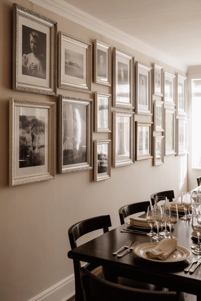Why it works: Keeps the layout balanced but interesting — perfect for long dining walls.