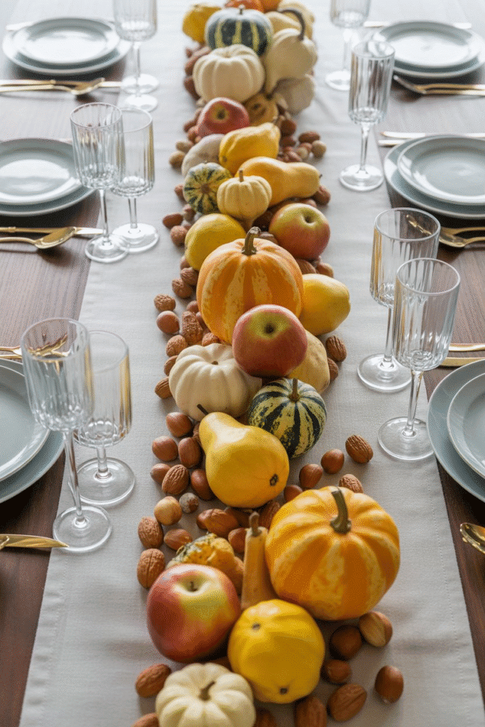 Line your table with apples, pears, gourds, and nuts for a centerpiece that doubles as a snack station. It’s abundant, festive, and perfectly in tune with the spirit of harvest.